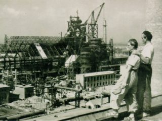 1952-1953 fordulóján középiskolából küldött gyakornokként talán egy hónap óta dolgoztam annál a hetente kétszer megjelenő újságnál, amelynek a címe így hangzott: Sztálin Vasmű Építője. Ez idő tájt írók gyakran kaptak megbízatást, ösztönzést, hogy írjanak az épülő Sztálinvárosról. Örkény is. A lap lelkes interjúkat szokott közölni velük írói terveikről. Amit sikerült előkeríteni, egyik-másikba most beleolvastam. (Nem volt nagy öröm.) Örkény-interjú nincs, mert a következő történt. Szakadó téli esőben érkezett meg, a kísérője azonnal elvitte valamelyik munkahelyre. (Egy ismert, sokszor reprodukált fénykép is van erről a napról: felöltőben, kalapban áll a gép előtt, tárgyilagosan pillant a lencsébe, mögötte daruk látszanak.) Nagy nehezen rátaláltam. Nem hangolta fel a lehetőség, hogy egy gyerkőcnek interjút adhat. Kért egy példányt a lapból, ránézett, azt mondta a címre, hogy “különösebb feszültséget nemigen lel benne”. Egyébként a Szabad Népbe fog írni riportokat. Ennél többet egyelőre maga sem tud. A munkáról pedig jobb lesz majd utána s nem előtte beszélni. Különben sincs ideje, egy óra múlva a városi párttitkárnál kell lennie bemutatkozó beszélgetésen.