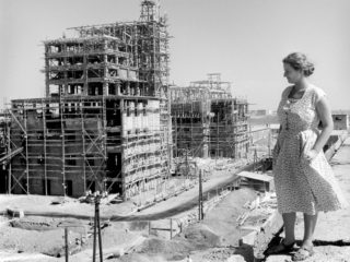 Tevan Zsófia mérnök, a nőépítkezés vezetője és Tóth Éva, a nőépítkezés egyik munkavezetője boldogan szemlélik hatalmas békeművünk új alkotásait, a napról napra szépülő Sztálinvárost