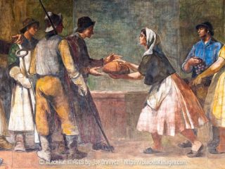 Sokat írtak a műről, reprodukálták, méltatták, így talán fölösleges most bővebben szólni róla: a méltóságteljes szépséggel megformált alakokban népünk jellegzetes alakjai magasodnak típusokká. Az árnyalt finomsággal egyénitett figurákat szíves-örömest szemléli, nézi minden látogató: Domanovszkynak sikerült általános érvénnyel önteni képbe elgondolását. S még egy szót csak az egyik nőalakról: ez legtöbbször reprodukált figurája a műnek, s később is visszatér az oeuvre-ben: a parasztok csoportjának egyik leginkább szívet melengető, szemet gyönyörködtető alakja a félig balra forduló, oldalához kosarat szorító, lépő nőalak. A kompozíció lezárt háttér előtt játszódik, a figurák fény-árnyékkal modelláltak, képi gondolkodásában tehát pontosan illeszkedik Domanovszky az időtájt készült más műveihez, bizoyos fokig azoknak továbbfejlesztése.