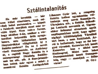 Ezeket az eseteket ki kell vizsgálni, de azért jó, ha egy kicsit elgondolkozunk ezen. Mert Szlálinvárosban a “hőskor” maradványaképpen elharapódzott az a szokás, hogy az emberek nem “adnak magukra”. Moziba, színházba, bálba mennek meszes, olajos kezeslábasban, pufajkában – úgy, amint dolgoztak benne. Van ennek jó oldala is. Az tudniillik, hogy minálunk nagy becsülete van a munkának. És a munkások büszkék arra, hogy ők – munkások. Úgy van: legyenek is büszkék! Elvtársak, szaktársak, igen nagy rang ez!