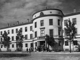 Ünnepség Sztálinváros Tanácsának is helyet adó általános iskola épülete előtt