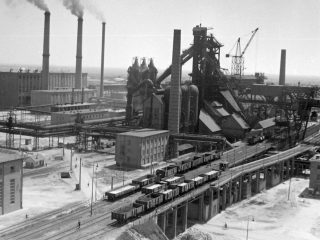 Szovjet gyártmányú gépekkel rendezik a talajt a vasmű építésén.