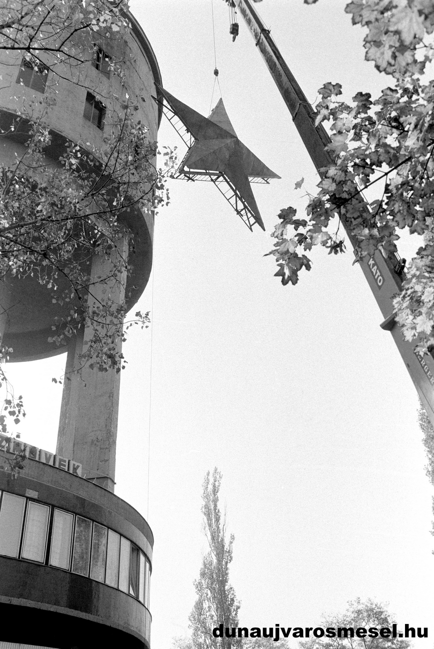 Dunaújvárosban a régi Építõk úti víztoronyról szerelik le a vörös csillagot.