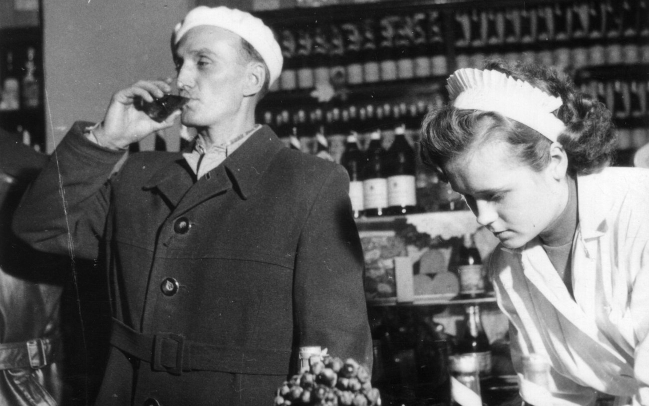Ezt a helyiséget nem tudjuk másként titulálni: kocsma. A polcok mellett kókadt iddogálók. Markolják a fröccsös poharat, némelyik handabandázva beszél, de senki sem figyel rá.