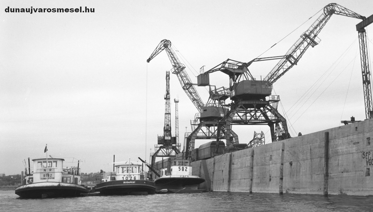 A kikötõben kirakják a vasércet a szovjet, a magyar és a román uszályokból. /1956