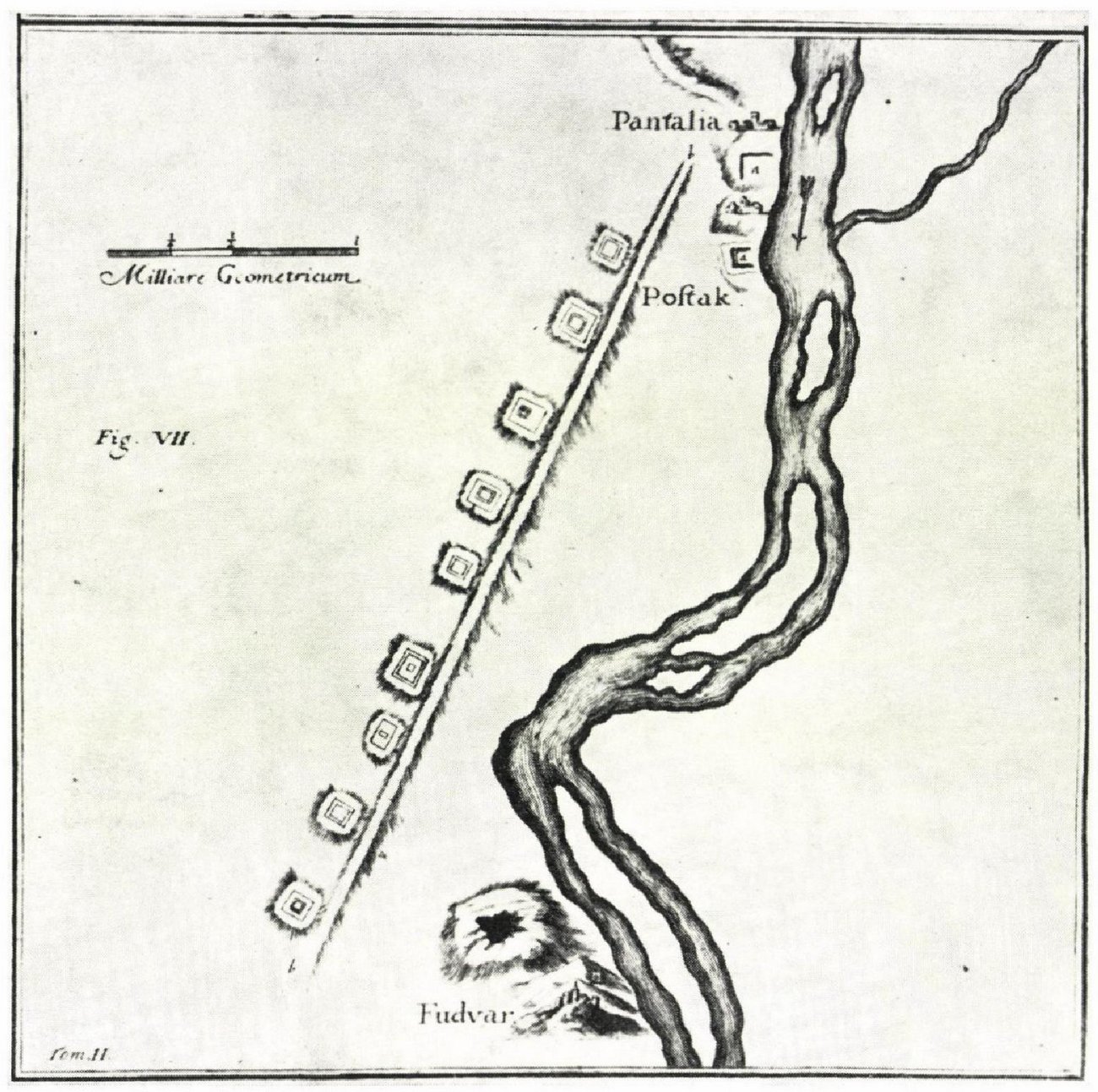 Időzzünk egy kissé a római utaknál is. Dr. Bóna István írja: “Akkoriban (1730-40 körül) még jól látszott a római út Adonytól Kisapostagig terjedő szakasza, ez Pentelétől nyugatra nyílegyenesen futott, nagyjából a modern 6-os út táján – tehát a mai elképzelésekkel ellentétben nem haladt át Pentelén, soha nem érintette Intercisát, amelyhez csak bekötő utak vezettek.“