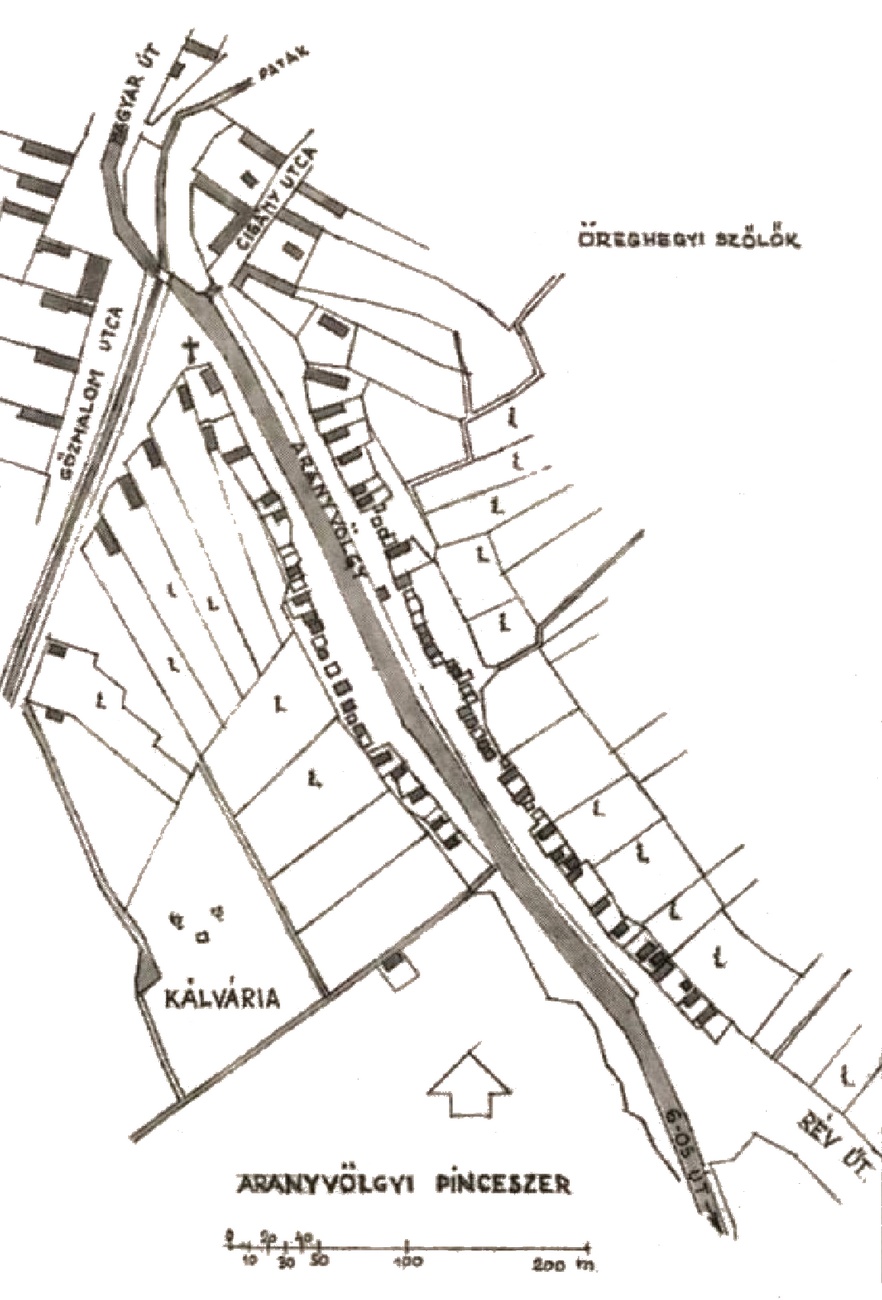 Szép, regényes hely volt az aranyvölgyi pincesor kezdete. A betorkolló utak kis teret alkottak, az utak kezdetén nagyobb épületekkel, amelyek mögé megbújva sorjáztak az utcai kis házacskák. A tér közepét mély, szakadékos patak szelte át zúgóval, felette a boltozott téglahíd. Nem messze az út szélén a léckerítéssel övezett fakereszt, melynek helyét a plébánia 1797. évi feljegyzése így adja meg: In fine possessionis versus Földvárinum. A kereszt előtt mindig volt virág. Tervezte valaki az együttest, vagy csak így sikerült? Eltűnt a múltban…