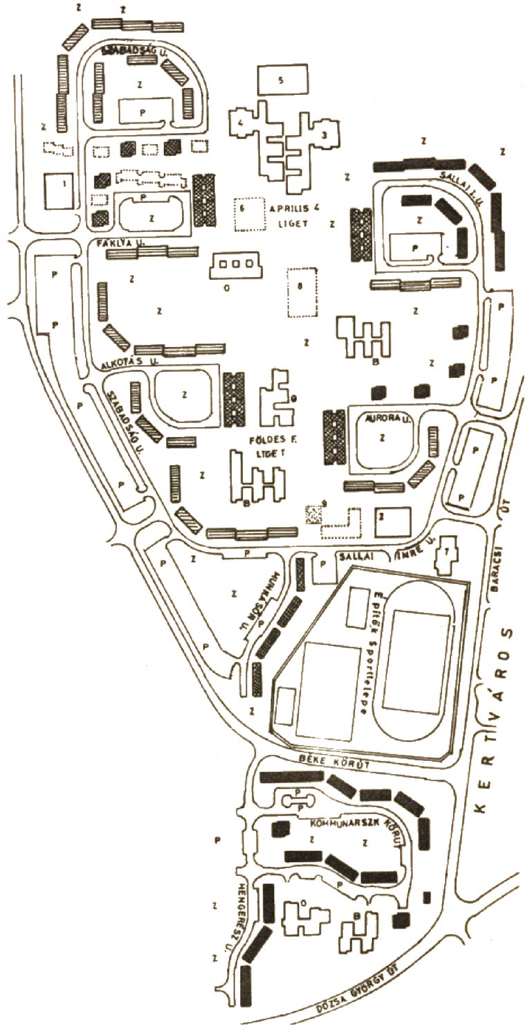 Rajzunkon fekete színnel jelöltük a már elkészült lakóépületeket, s amelyekbe várhatóan ez év végéig beköltözhetnek a lakók. Vízszintes csíkozással jelöltük a tervezett négyemeletes lakóházakat, míg a tízszintes épületeket sűrű, átlós vonalkázással különböztettük meg. A középületek közül O, illetőleg B betű jelzi az óvodákat és a bölcsődéket. A leendő két ABC-áruház az 1-es és 2-es számot viseli, ám közülük az 1-es diákétteremként ideiglenesen fog megépülni, míg a végleges étterem a 6-os számmal jelölt épületben kap helyet. 3-as és 4-es szám jelzi a két 20-20 tantermes általános iskolát, míg a hatalmas közös tornaterem az 5-ös számot viseli. 7-es számmal jelöltük a leendő szövetkezeti étterem és presszó helyét. Kipontozott kontúr szemlélteti a távlatban felépíthető középületeket, amelyek közül említést érdemel a szabadidőközpont (8) és az többszintes irodaház (9). Az összefüggő zöld területeket Z, a gépkocsiparkolókat P betűvel jelöltük