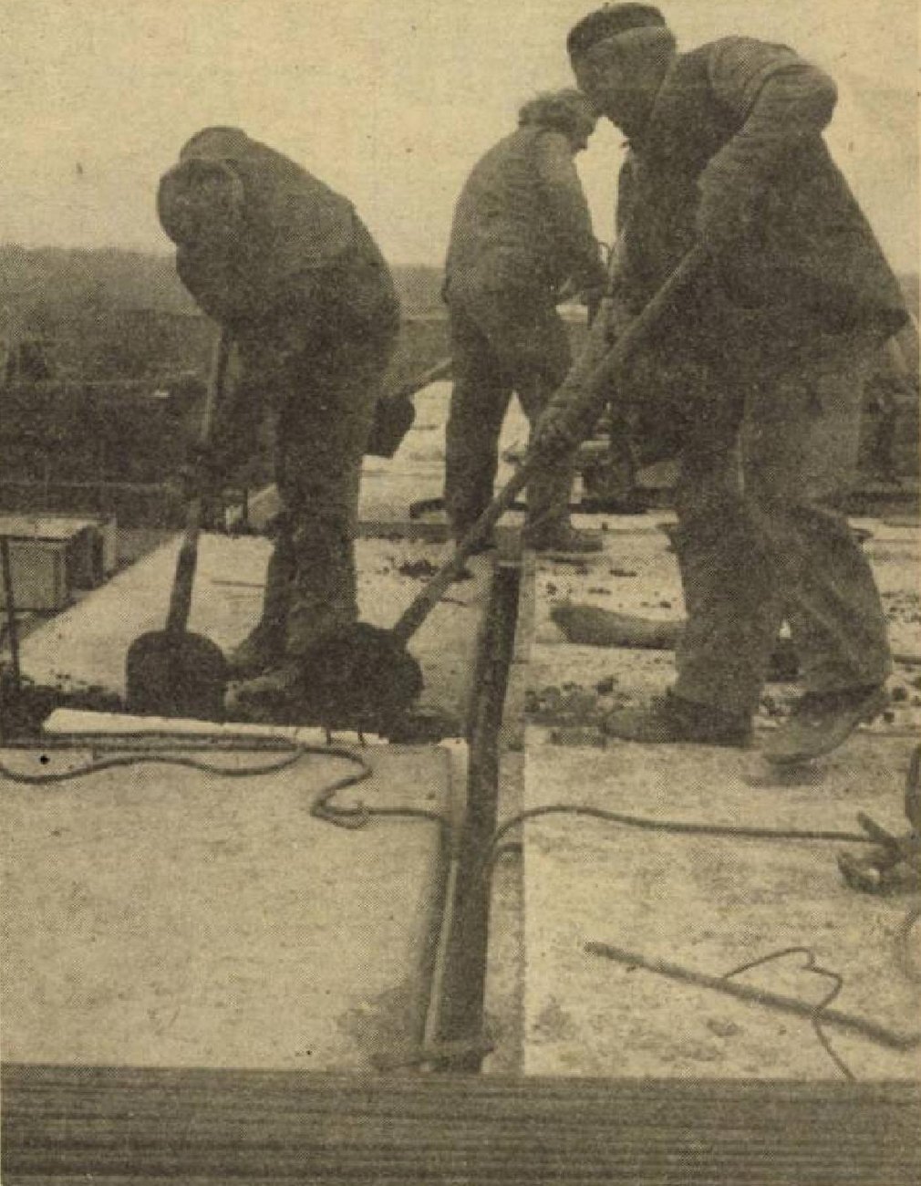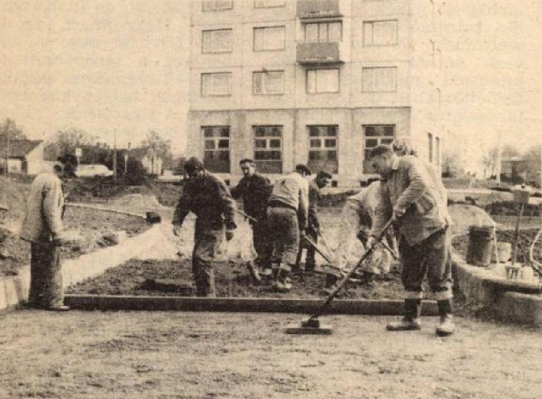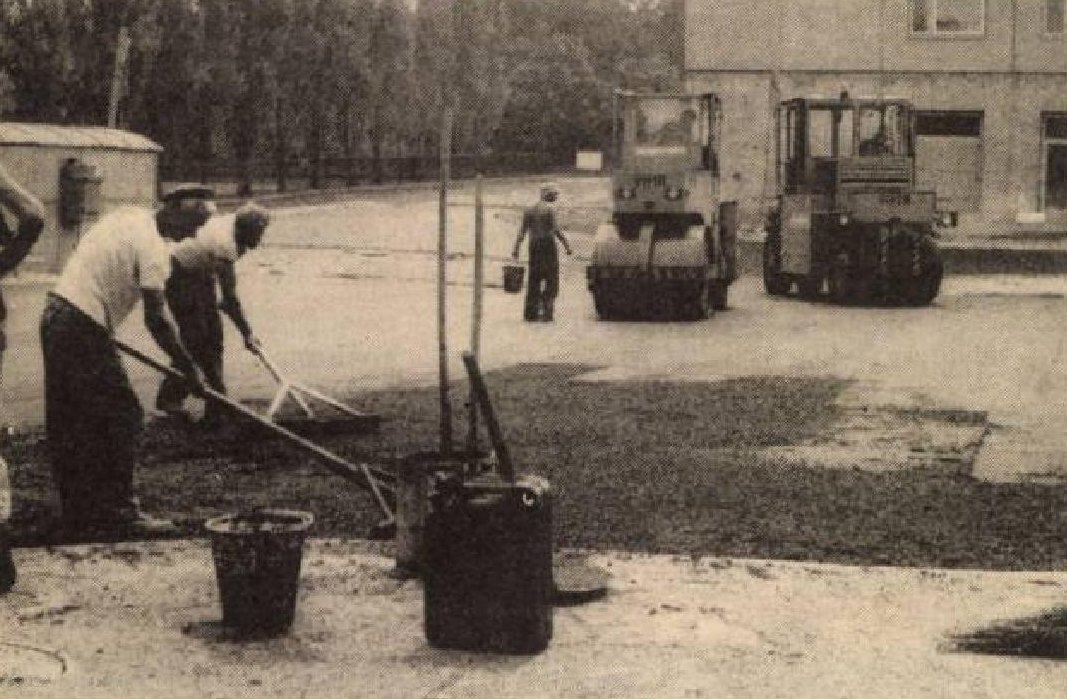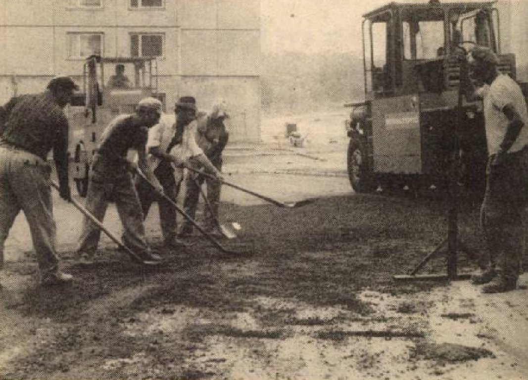 Egyre inkább városias külsőt ölt magára a Béke városrész. Ennek egyik jele képünkön is látható. A már elkészült és az új lakók által birtokba vett házak közül a Betonútépítő Vállalat dolgozói az utakat és a járdákat aszfaltozzák.