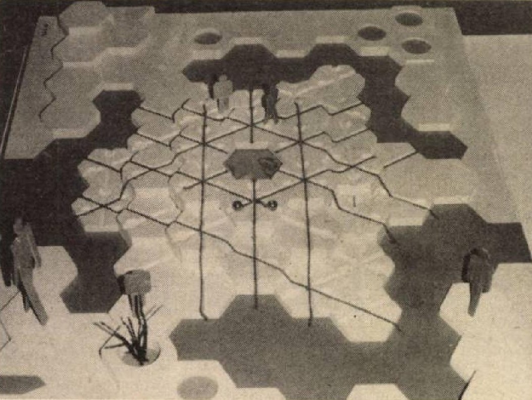 Vízjáték-terv. A hatszögletű vízmedencéből előre bemélyített árkokon folydogál le a víz az alul levő medencékbe, játéklehetőséget kínálva a pancsolni vágyó gyerekeknek. A vízjáték lefolyóárkai tetszőleges helyen elrekeszthetők, így változtatható a víz útja. Előny még a vízjáték könnyű tisztíthatósága.