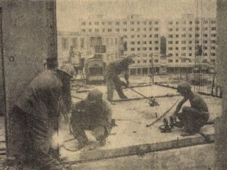 Zsoldos Lászlóval, a 26-os Állami Építőipari Vállalat 3. számú főépítésvezetőségének művezetőjével egy most készülő toronyház harmadik emeleti lakásának ablakából nézzük a nyüzsgést.