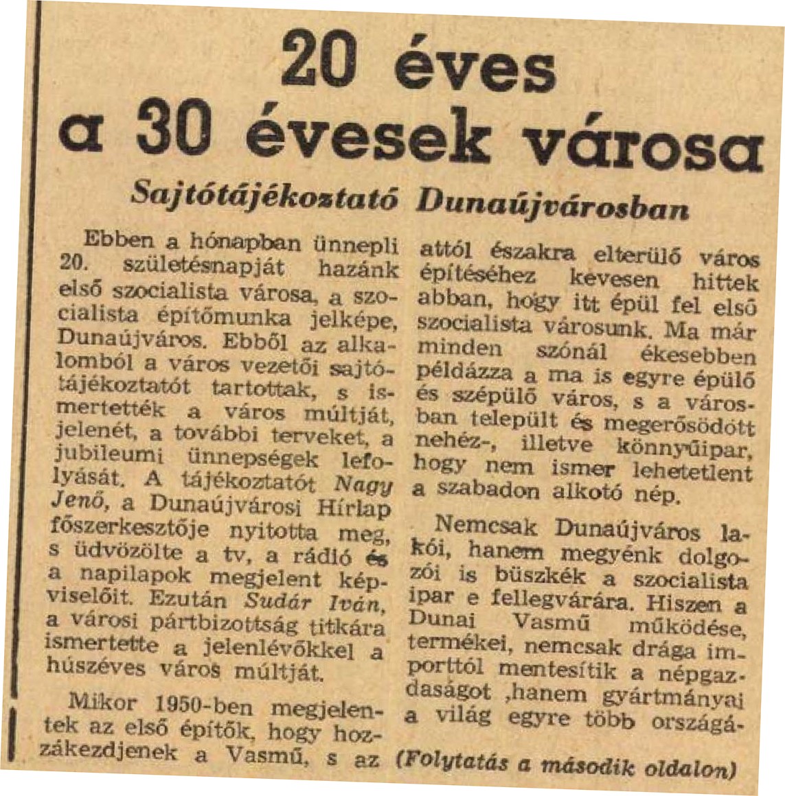 Húsz éves Dunaújváros és most ismét a magyar sajtó érdeklődésének előterébe került. Ez a város az egész ország erőfeszítéséből épült, természetes, hogy nemcsak lakói büszkék rá. Az alábbiakban a magyar sajtóban Dunaújvárosról megjelent cikkek, méltatások, tudósítások között tallózunk.