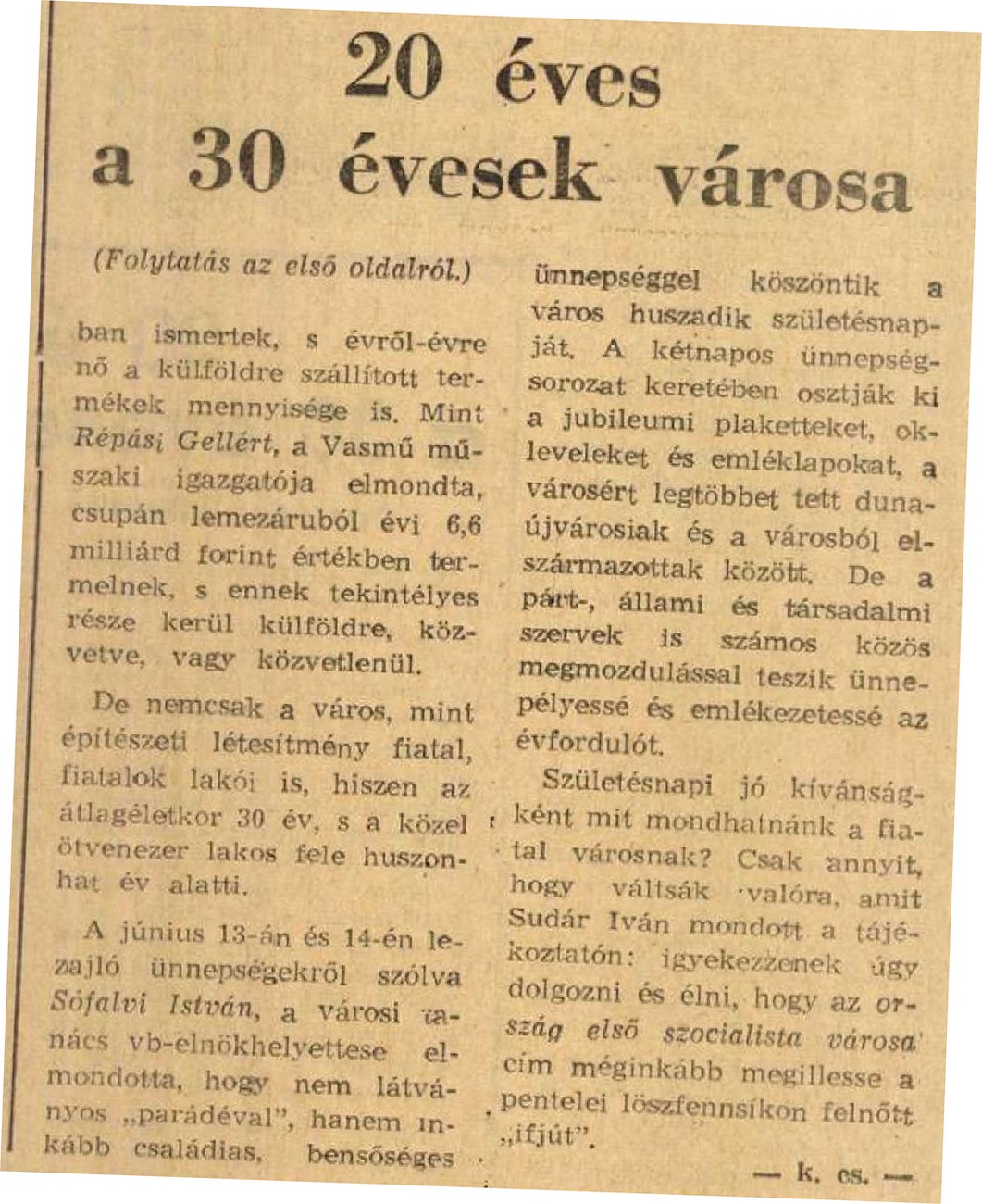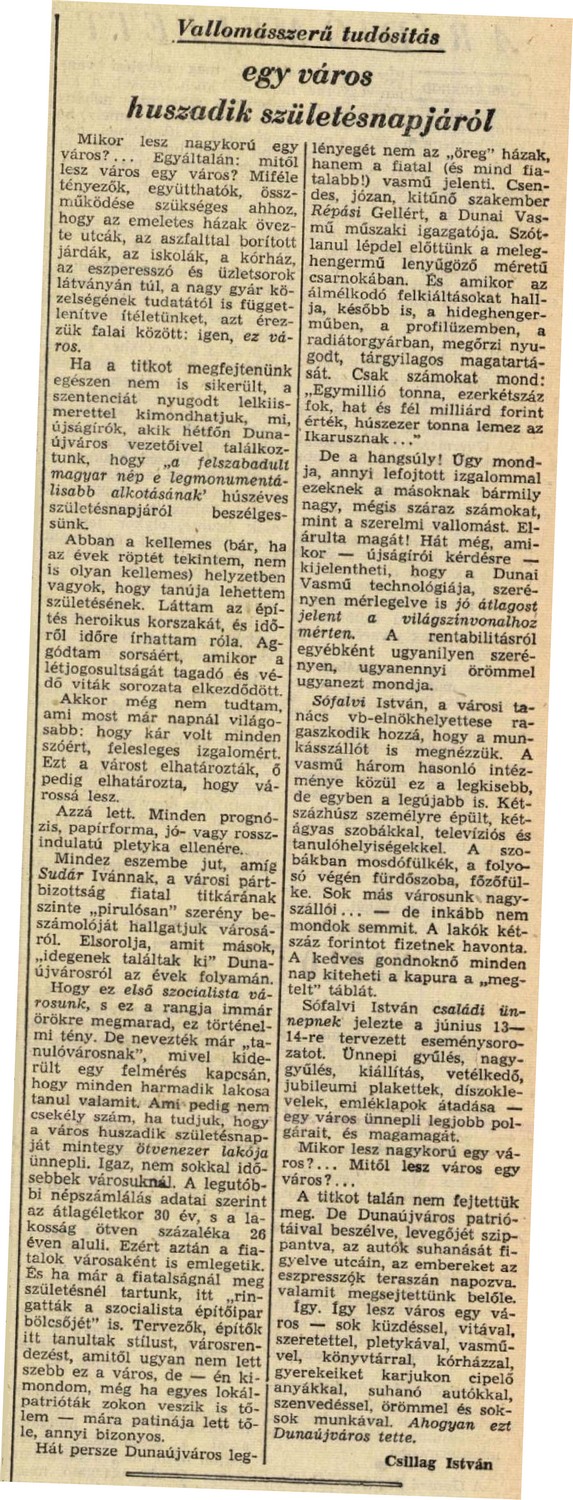 A méltató-emlékező cikk felvillantja a vasmű méreteit, a város utcáit és embereit, úgy ismerteti statisztikai adatait, mint szerelmes ifjú kedvese jó tulajdonságait. Szívesen olvassa minden dunaújvárosi a megható befejezést is: “Mikor lesz nagykorú egy város? Mitől lesz város egy város? A titkot talán nem fejtettük meg. De Dunaújváros patriótáival beszélve, levegőjét szippantva, az autók suhanását figyelve utcáin, az embereket az eszpresszók teraszain napozva, valamit megsejtettünk belőle. Így. Így lesz város egy város – sok küzdéssel, vitával, szeretettel, pletykával, vasművel, könyvtárral, kórházzal, gyerekeiket karjukon cipelő anyákkal, suhanó autókkal, szenvedéssel, örömmel és sok-sok munkával. Ahogyan ezt Dunaújváros tette.”