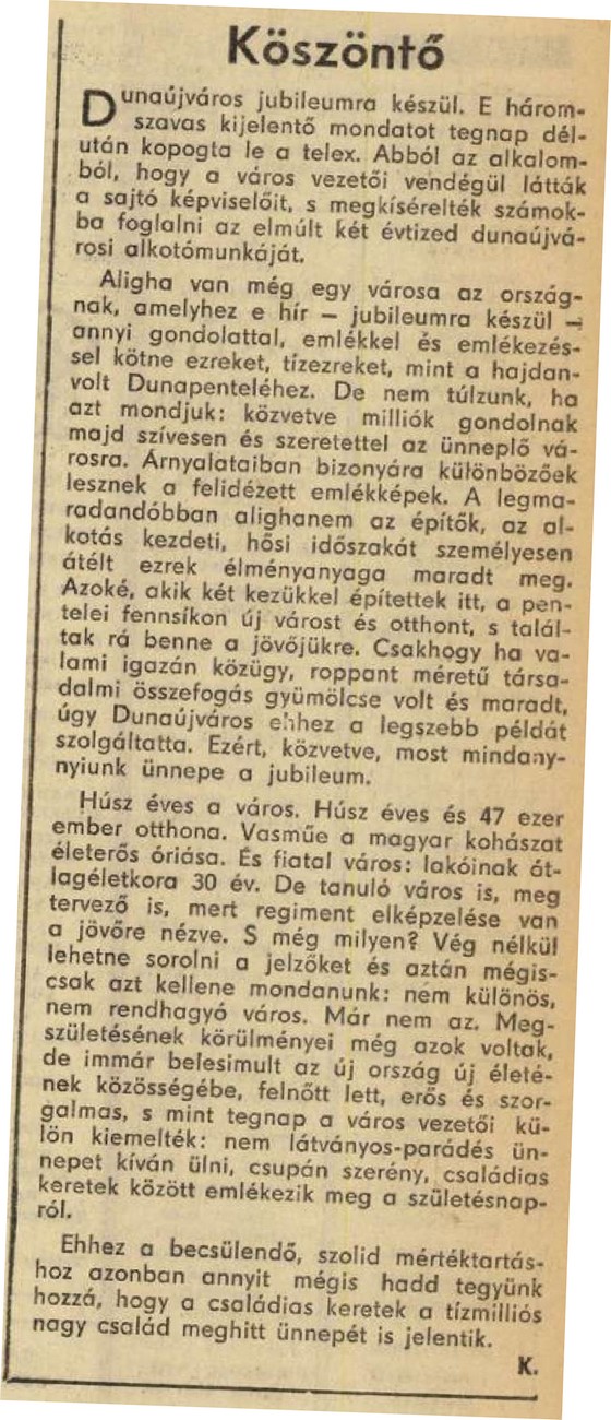 “Húsz éves a város. Húsz éves és 47 ezer ember otthona. Vasműje a magyar kohászat életerős óriása. És fiatal város: lakóinak átlagéletkora 30 év. De tanuló város is, meg tervező is, mert regiment elképzelése van a jövőre nézve. S még milyen? Vég nélkül lehetne sorolni a jelzőket és aztán mégiscsak azt kellene mondanunk: nem különös, nem rendhagyó város. Már nem az. Megszületésének körülményei még azok voltak, de immár belesimult az új ország új életének közösségébe, felnőtt lett, erős és szorgalmas.” – olvashatjuk a Magyar Hírlap köszöntőjében.