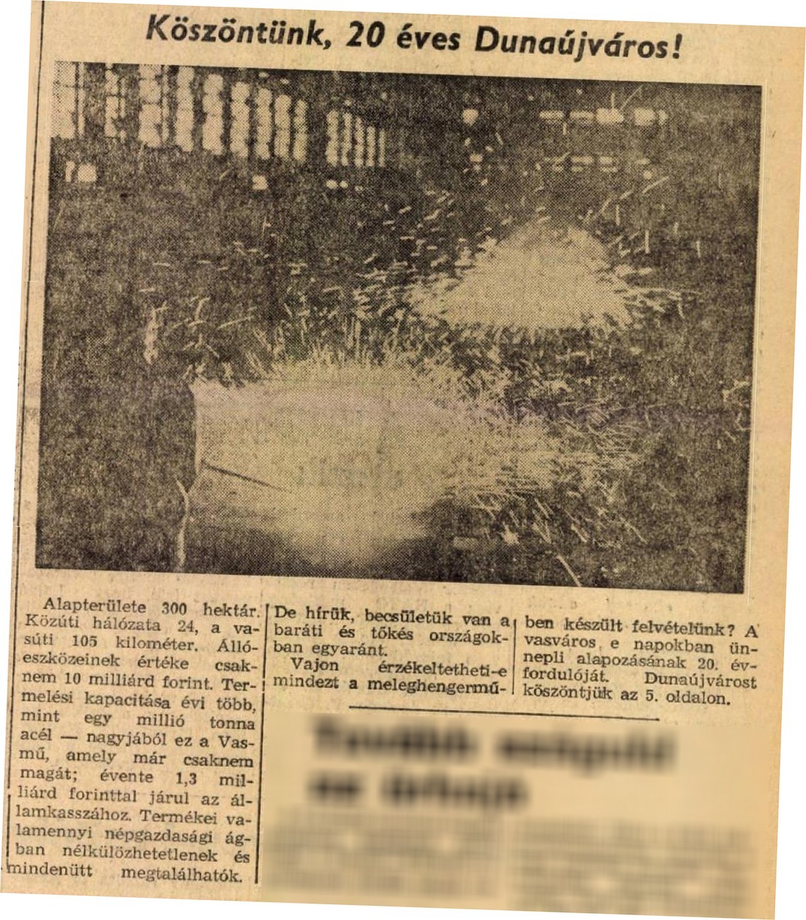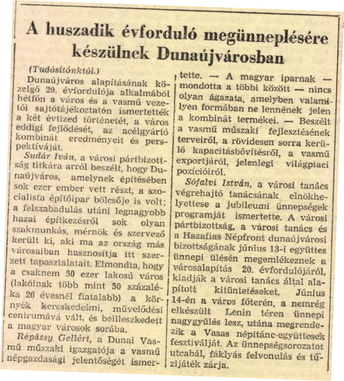 Tudósításban számolt be Dunaújváros jubileumának előkészületeiről. Az alapítás 20 éves évfordulójának programját ismertette és a város vezetőinek nyilatkozatát közölte az előzetes sajtótájékoztató alapján. “Dunaújváros, amelynek építésében sok ezer ember vett részt, a szocialista építőipar bölcsője is volt. A felszabadulás utáni legnagyobb hazai építkezésről sok olyan szakmunkás, mérnök, szervező került ki, aki ma az ország más városaiban hasznosítja itt szerzett tapasztalatait. A csaknem 50 ezer lakosú város a környék kereskedelmi, művelődési centrumává vált, és beilleszkedett a magyar városok sorába” – olvashatjuk a méltatással felérő tudósításban. A cikkben a Dunai Vasmű jelentőségéről, fejlesztéséről is szó esik.