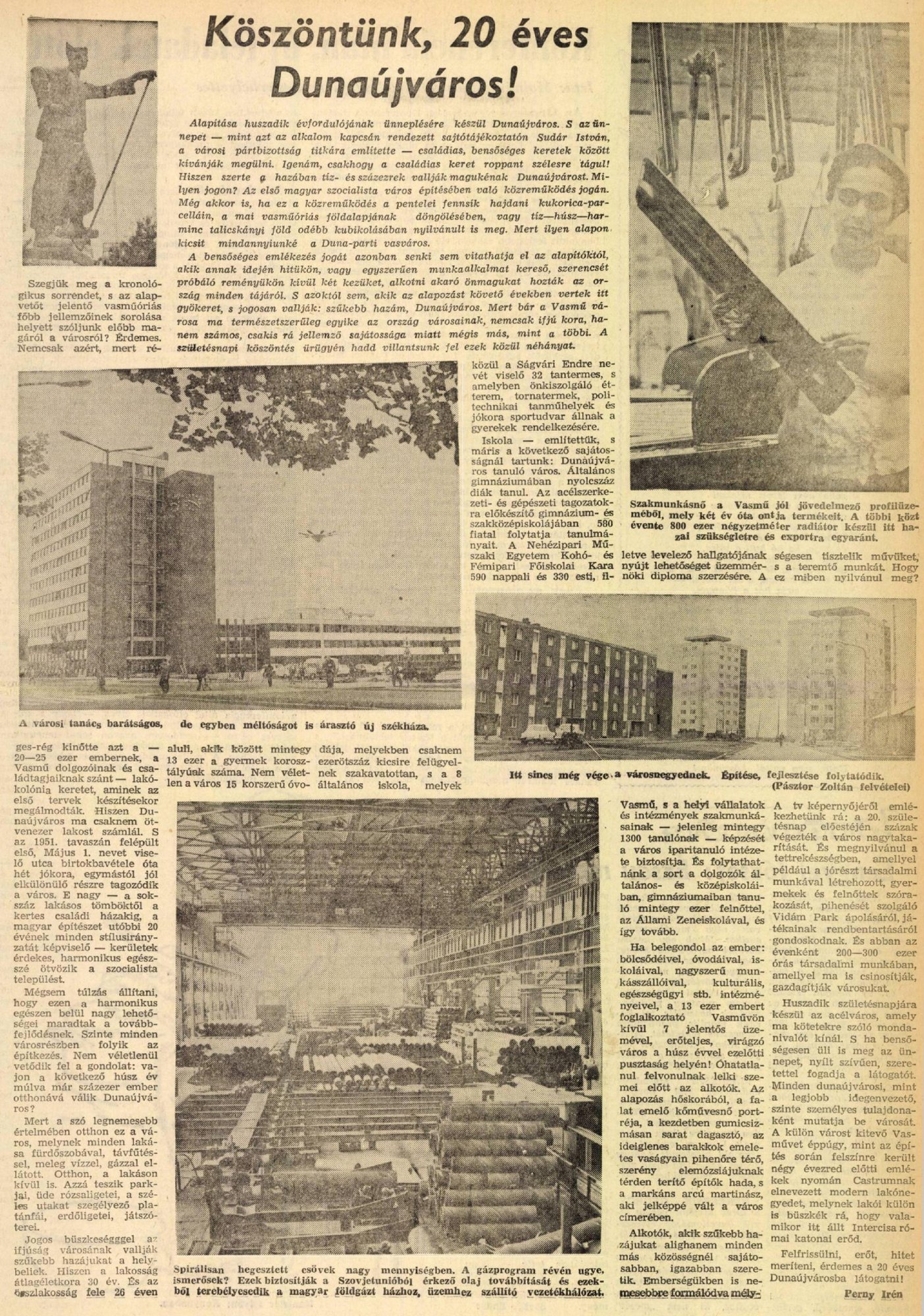A Petőfi Népe nemcsak az épületekről, a gyárakról ír, hanem a dunaújvárosiakról is: “Alkotók, akik szűkebb hazájukat alighanem minden más közösségnél sajátosabban, igazabban szeretik. Emberségükben is nemesebbre formálódva, mélységesen tisztelik művüket, s a teremtő munkát.” “Alapítása huszadik évfordulójára készül Dunaújváros. S az ünnepet családias, bensőséges keretek között kívánják megülni. Csakhogy a családias keret roppant szélesre tágul! Hiszen szerte a hazában tíz- és százezrek vallják magukénak Dunaújvárost” – írja riportjában Perny Irén. Petőfi Népe dunaújvárosi oldalának befejező mondata így hangzik: “Felfrissülni, erőt, hitet meríteni, érdemes a 20 éves Dunaújvárosba látogatni!”