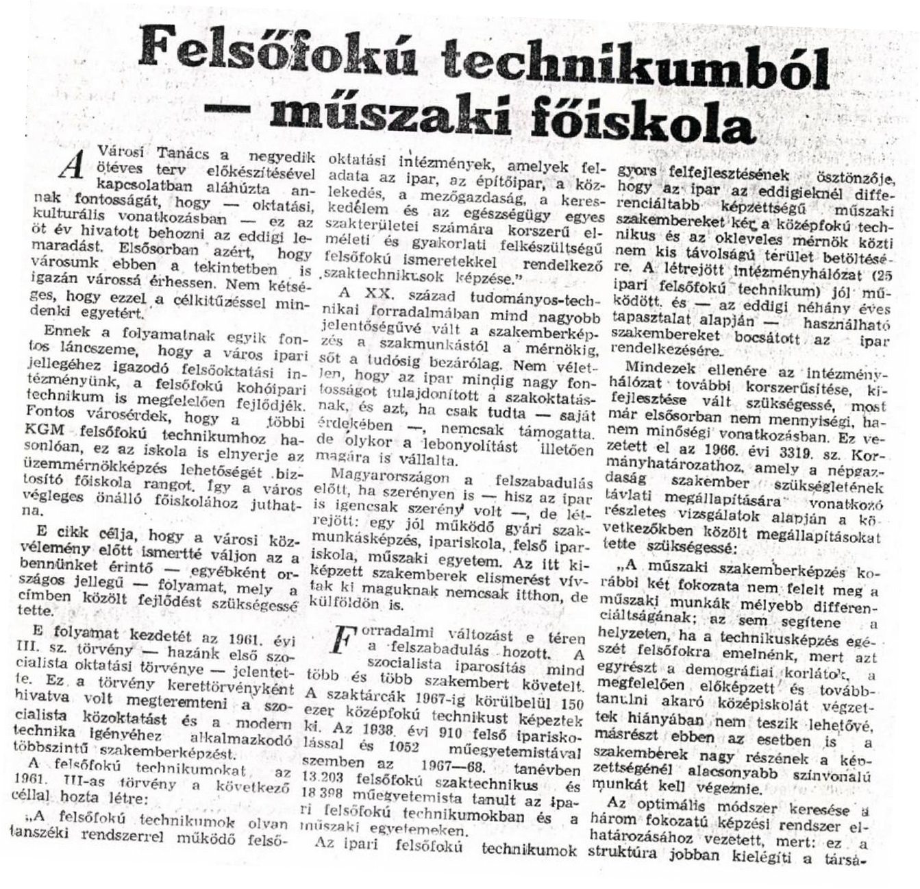 Sajtómegnyilvánulások a Dunaújvárosi Hírlapban1969. március 4-én “A főiskolai városért” cikkemben ekképp szóltam az iskolák fontosságáról: “Az iskola oktató-nevelő munkájának eredményessége mindenkor közvetlen kihatott az illető város lakosságának műveltségére, szakmai tudására. Jobb iskola jobb szakmai tudás, nagyobb kultúra. Történelmi tény, hogy sok várost híressé elsősorban iskolái tették…” “A város fontos eleme az ifjúság. Ha itt főiskola van, ezt sok mindent jelenthet. A város fiatalságának értékes lehetősége van továbbtanulásra. Az idesereglett más városból származó ifjúság (a hallgatói létszám a város lakosságának 2 százaléka), megismer bennünket, elviszi hírünket az egész országba…” “Az itt végzett és az egész országban szétszóródott szakembergárda az Alma Materre gondolva, abban nemcsak iskoláját, de a várost is fogja látni.” 1969. augusztus 5-én: “Igazodás az ipar igényeihez, egyetemi vélemény a Dunaújvárosi Műszaki Főiskoláról” címen dr. Kiss Ervin a Kohómérnöki Kar dékánja az átszervezést előkészítő bizottság elnöke egész elsőoldalas interjút adott a Dunaújvárosi Hírlapnak. Interjújában hitet tett a felsőfokú technikumoknak műszaki főiskolákká történő átszervezése mellett, és ezt részletesen indokolta is. A fennálló lehetőségek figyelembevételével jónak tartotta a magyarországi kohászképzést figyelembe véve, hogy Dunaújvárosban egyetemhez tartozó főiskolai kar jött létre. Biztosította a kart az egyetem segítő szándékáról és arról, hogy kellő önállósággal az egyetemi karokkal egyenlő joggal működhet. “Nem hatalmi törekvések, hanem a mindnyájunk által szeretett kohászat egyetemes érdeke kívánja a fúziót. És azt hiszem, hogy a fiatal dunaújvárosi intézménynek végülis nem visszalépés a tekintélyes és nagy múltú Selmecbányai és soproni, majd miskolci egyetemhez tartozni.”