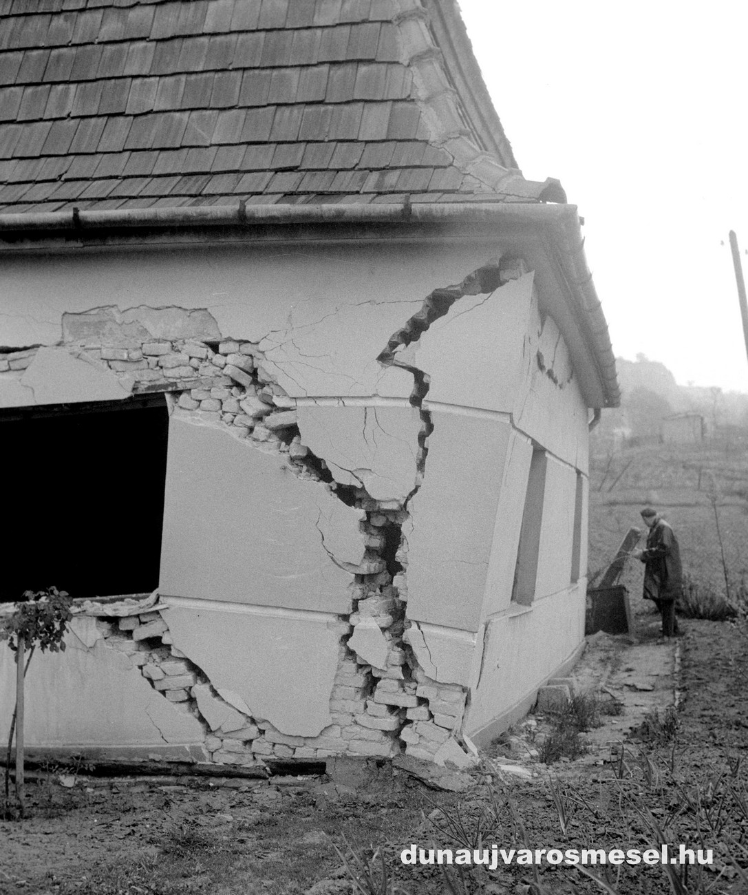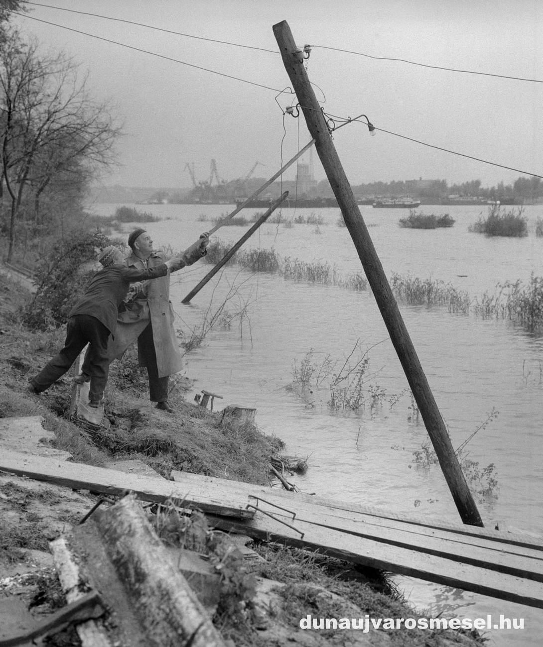 Szekeres István földcsuszamlástól megsérült családi háza és a Dunai Vasmû horgász-egyesületének tanyáján megsérült villanyoszlop helyreállítása /1965
