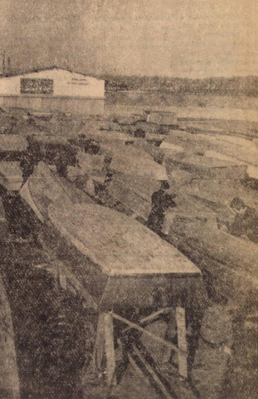 A Vasmű Horgász Egyesületének új horgásztanyája társadalmi munkával épül a Duna-parton. Társadalmi munkával készült az épület terve is. Képünk a tanyaépület homlokzatát ábrázolja a Duna felöl nézve. Az épülethez még egy tárolóhelyiség is tartozik, ahol öltöző és raktár lesz, sőt a helyiség csónakjavításra is szolgálhat. A B-jelzésű tarnyaépület víz felöli részén hosszú tornác húzódik, belül egyszobás tanyaőri lakás, négy vendégszoba, irodahelyiség és egy klubhelyiség nyer elhelyezést. A tanyaépület 32 méter hosszú lesz.