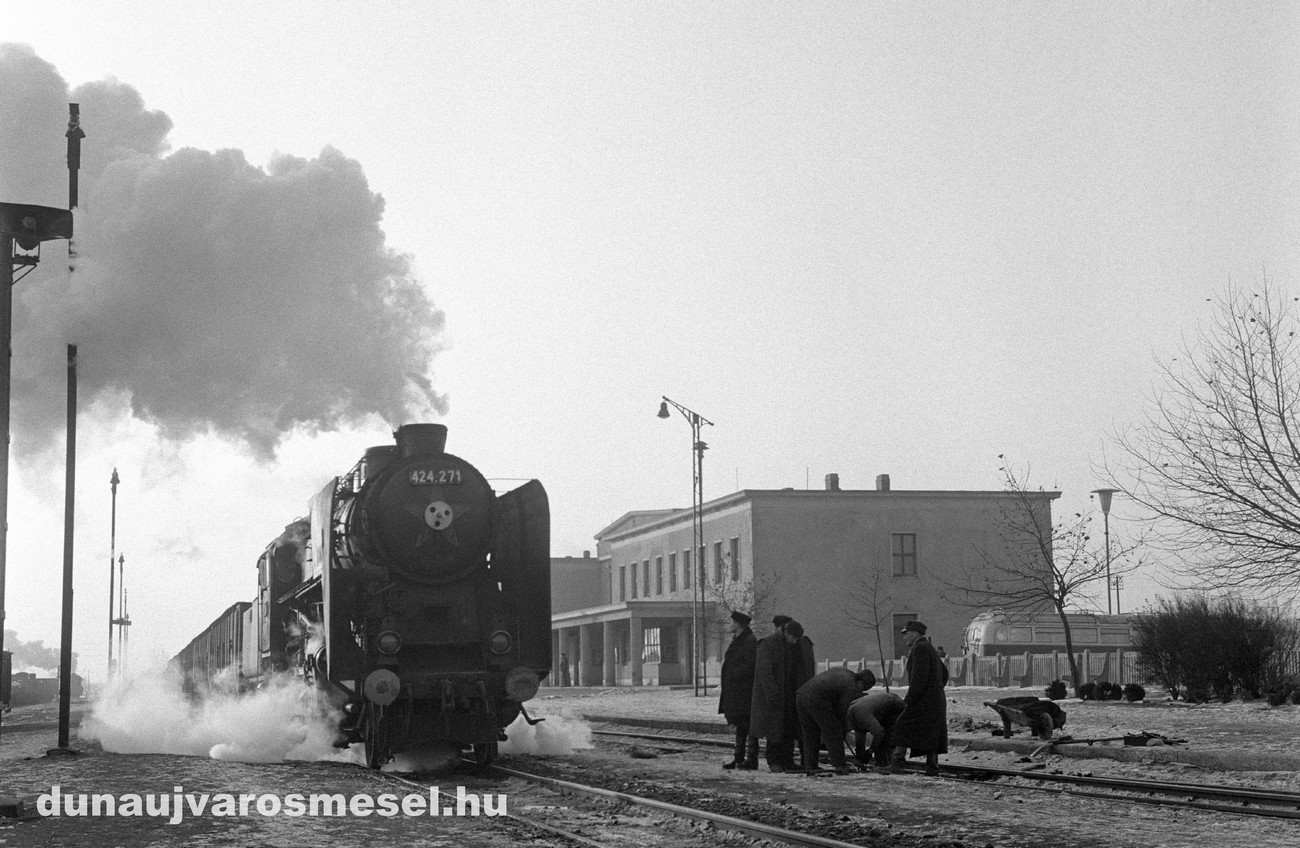 A MÁV 424 sorozatú gõzmozdonya a dunaújvárosi vasútállomáson. /1966