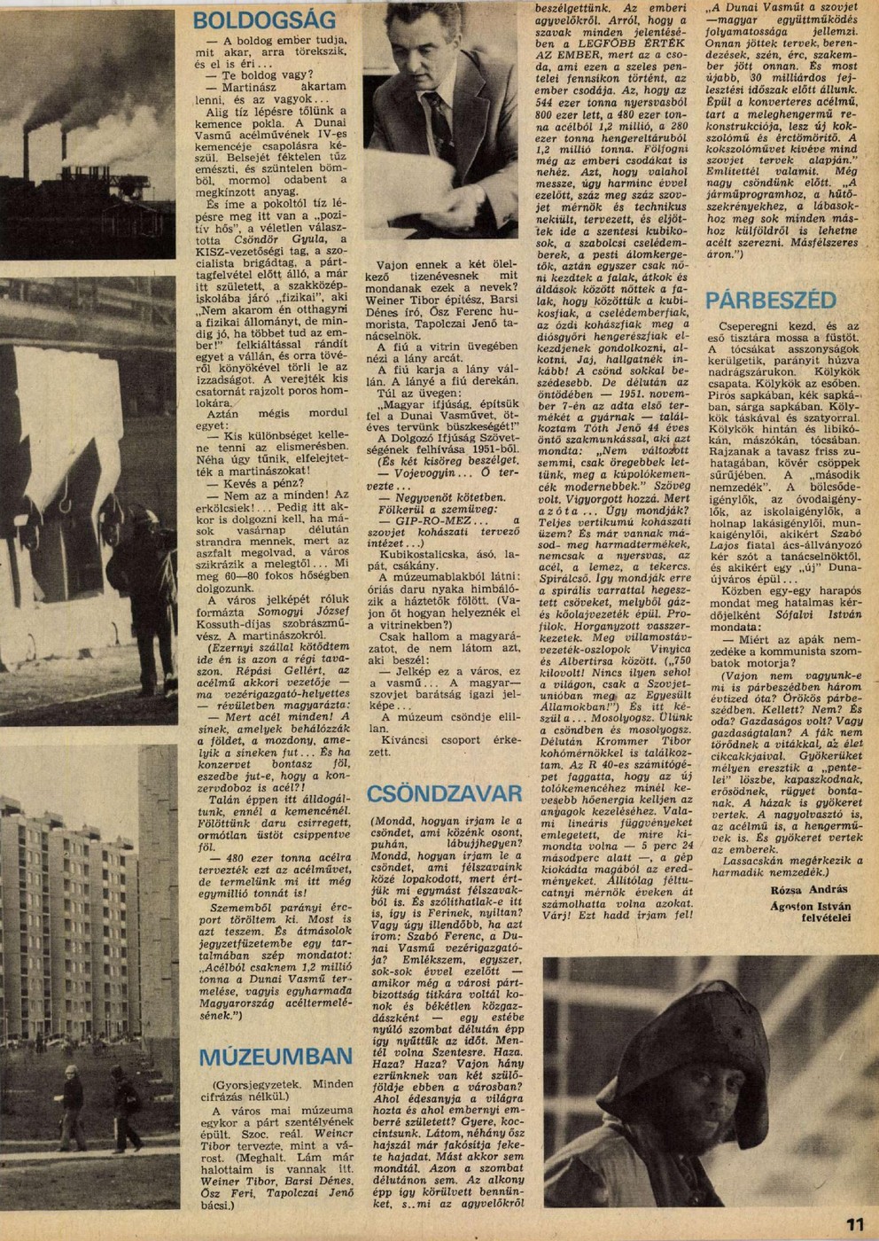 Mondd, hogyan írjam le a csöndet, ami közénk osont, puhán, lábujjhegyen? Mondd, hogyan írjam le a csöndet, ami félszavaink közé lopakodott, mert értjük mi egymást félszavakból is. És szólíthatlak-e itt is, így is Ferinek, nyíltan? Vagy úgy illendőbb, ha azt írom: Szabó Ferenc, a Dunai Vasmű vezérigazgatója? Emlékszem, egyszer, sok-sok évvel ezelőtt – amikor még a városi pártbizottság titkára voltál, konok és békétlen közgazdászként – egy estébe nyúló szombat délután épp így nyűttük az időt. Mentél volna Szentesre. Haza. Haza? Vajon hány ezrünknek van két szülőföldje ebben a városban? Ahol az édesanyja a világra hozta, és ahol embernyi emberré született? Gyere, koccintsunk. Látom, néhány ősz hajszál már fakósítja fekete hajadat. Mást akkor sem mondtál, azon a régi szombat délutánon. Az alkony épp így körülvett bennünket, s mi az agyvelőkről beszélgettünk. Az emberi agyvelőkről. Arról, hogy a szavak minden jelentésében a LEGFŐBB ÉRTÉK AZ EMBER, mert az a mikrocsoda, ami ezen a szeles pentelei fennsíkon történt, az ember csodája. Az, hogy az 544 ezer tonna nyersvasból 800 ezer lett, a 480 ezer tonna acélból 1,2 millió, a 280 ezer tonna hengereltáruból 1,2 millió tonna. Fölfogni még az emberi csodákat is nehéz. Azt, hogy valahol, messze, úgy harminc évvel ezelőtt, száz meg száz szovjet mérnök és technikus nekiült, tervezett, és eljöttek ide a szentesi kubikosok, a szabolcsi cselédemberek, pesti álomkergetők, meg az a itt menedéket remélő csalók, szélhámosok, dörzsölt vagányok, kurvák, ellenséges szívű politizálók, börtönből szabadultak – aztán egyszercsak nőni kezdtek a falak, átkok és áldások között nőttek a falak, hogy közöttük a kubikosfiak, a cselédemberfiak, az ózdi kohászfiak meg a diósgyőri hengerészfiúk (meg a kulákfik, vagányfik, kurvák fiai) elkezdjenek gondolkodni, alkotni.
