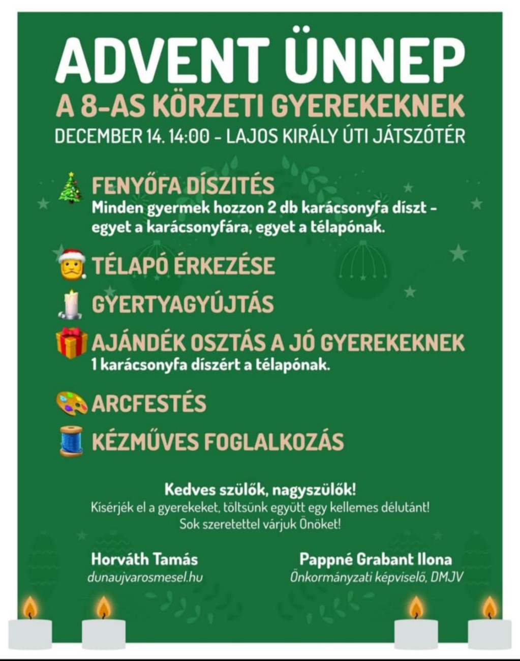 Adventi ünnep a 8-as körzet gyermekeinek! FENYŐFA DÍSZÍTÉS TÉLAPÓ ÉRKEZÉSE GYERTYAGYÚJTÁS AJÁNDÉK OSZTÁS ARCFESTÉS KÉZMŰVES FOGLALKOZÁS