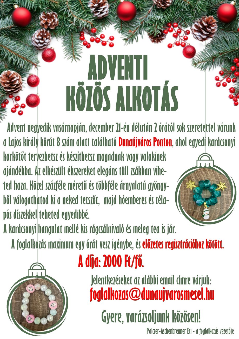 Advent negyedik vasárnapján, december 21-én délután 2 órától sok szeretettel várunk a Lajos király körút 8 szám alatt található Dunaújváros Ponton, ahol egyedi karácsonyi karkötőt tervezhetsz és készíthetsz magadnak vagy valakinek ajándékba. Az elkészült ékszereket elegáns tüll zsákban viheted haza. Közel százféle méretű és többféle árnyalatú gyöngyből válogathatod ki a neked tetszőt, majd hóemberes és télapós díszekkel teheted egyedibbé. A karácsonyi hangulat mellé kis rágcsálnivaló és meleg tea is jár. A foglalkozás maximum egy órát vesz igénybe, és előzetes regisztrációhoz…