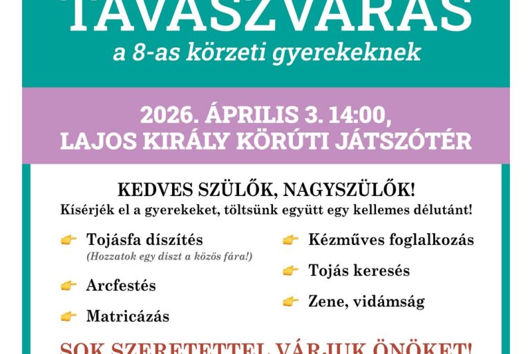HÚSVÉTI TAVASZVÁRÁS a 8-as körzeti gyerekeknek 2026. április 3-án 14 órától a Lajos király körúti játszótéren HÚSVÉTI TAVASZVÁRÁS...