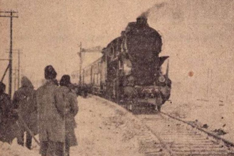 Hungarian Monitoring – 1954. február 1. Sztálinváros felé robog a vonat az új vonalon. (Németh Gy. felvétele.) /Szocialista Vasútért Új...