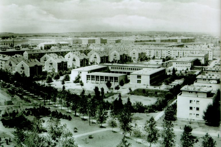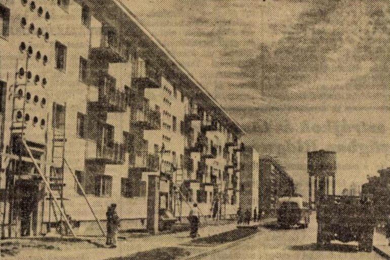Szabad Nép – 1956. május 15. Európa legkorszerűbb búgócsiga-raktára – Nem szatíra – Szalki-sziget látképe a kikötővel /1955 fotó: Fortepan/UVATERV...