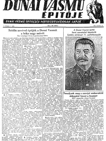A “Dunai Vasmű Építője” – a dunapentelei építkezés lapja December 21-én, Sztálin elvtárs 71. születésnapján jelent meg a “Dunai Vasmű...