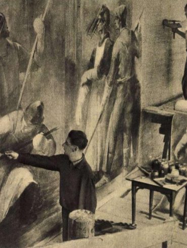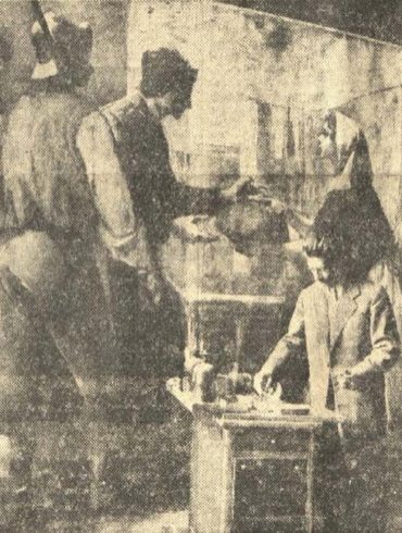 Szabad Ifjúság – 1955. szeptember 6. Hogyan készül a freskó? Vasmű főbejárata Domanovszky freskójával díszítve fotó: Corvina kiadó – Sztálinváros...