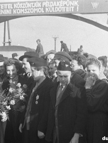 Népszava – 1951. február 25. Komszomolok Dunapentelén Mintha ezer és ezer ifjúmunkás ujjongása lobogtatná a vörös és nemzeti színű zászlókat,...