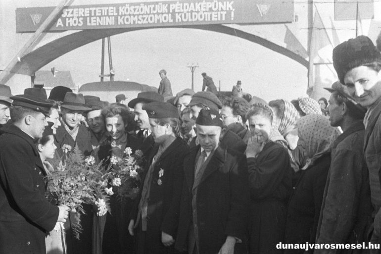 Népszava – 1951. február 25. Komszomolok Dunapentelén Mintha ezer és ezer ifjúmunkás ujjongása lobogtatná a vörös és nemzeti színű zászlókat,...